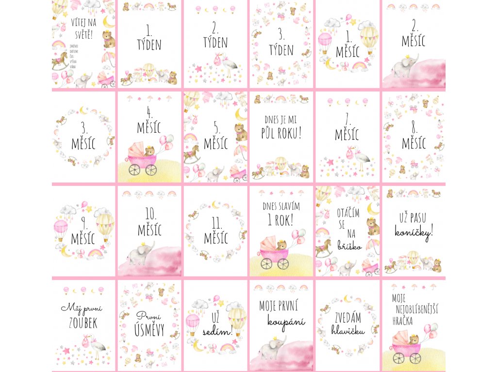 - sada 24 milníkových kartiček tištěných na kvalitním papíře 300g/m2 (formát cca A6). Kartičky je možné využít při fotografování nejdůležitějších milníků v prvním roce života miminka, případně je možné kartičky umístit do alba vedle dané fotografie. Kartičky jsou ve stejném designu jako naše dárkové balení.
