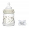 - set kojenecké láhve 150 ml a fyziologického silikonového dudlíku značky SUAVINEX, láhev disponuje kulatou silikonovou savičkou s pomalým průtokem a antikolikovými průduchy, vhodná již od narození, dudlík doporučený pro věk -2-4 měsíců, tedy vhodný dokonce i pro předčasně narozená či čerstvě narozená miminka, obojí bez BPA, klinicky testováno a vyrobeno španělským farmaceutickým výrobcem v rámci EU, použité barvy jsou přírodní a netoxické, vyrobeno ve spolupráci s Asociací španělských dětských pediatrů a dentistů - respektuje přirozený vývoj dásní, zubů i patra dítěte.