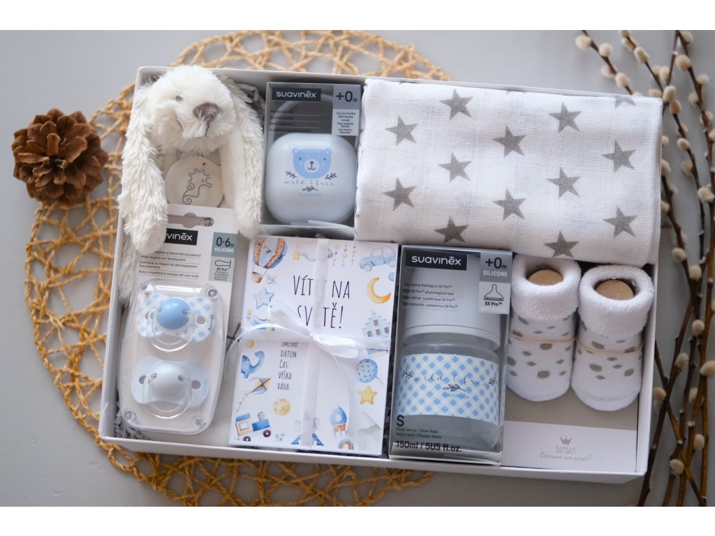 Dárková sada pro chlapečka v jemných odstínech modré obsahující 7 námi pečlivě vybraných kvalitních produktů. Důraz při výběru byl kladen především na kvalitu a funkčnost výrobků, věříme však, že potěší také po estetické stránce.